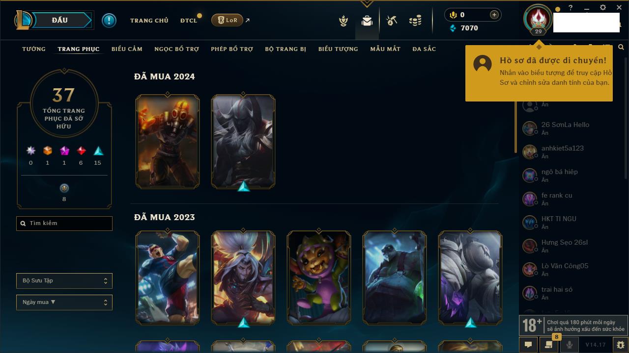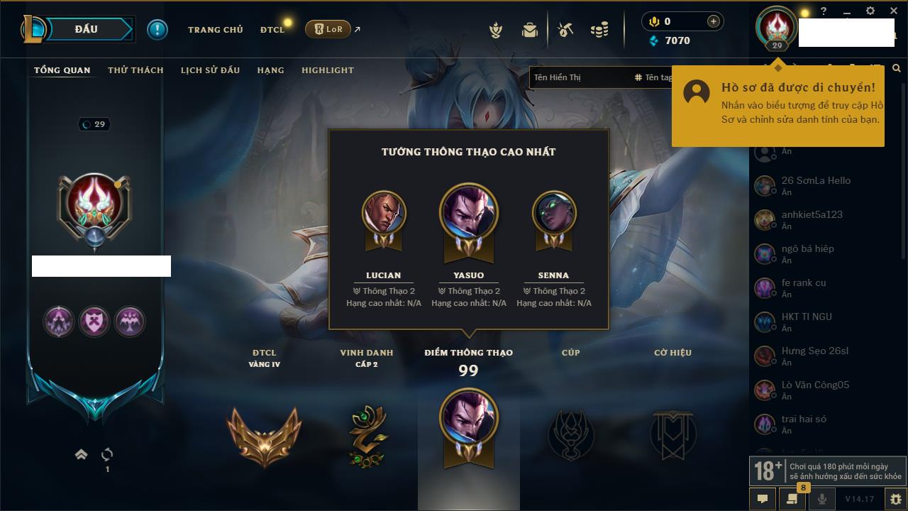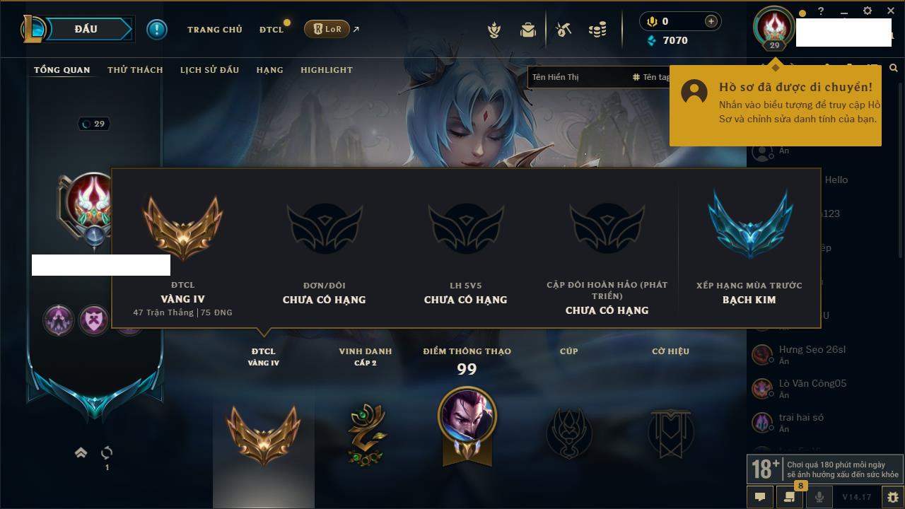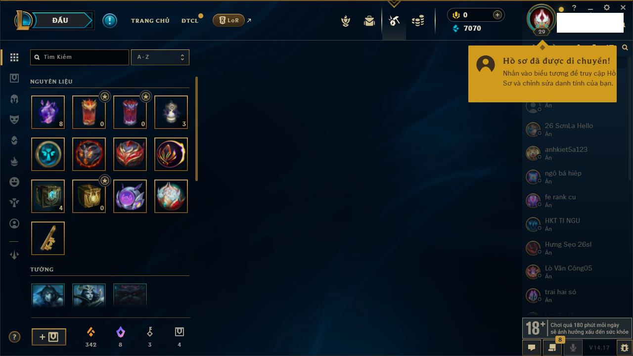 Rank Đơn: Chưa rank mùa nào Khung: Chưa có khung Tướng: 170 - Còn 3409 THX Trang Phục: 54 Rank ĐTCL: Chưa Rank Linh Thú: 170