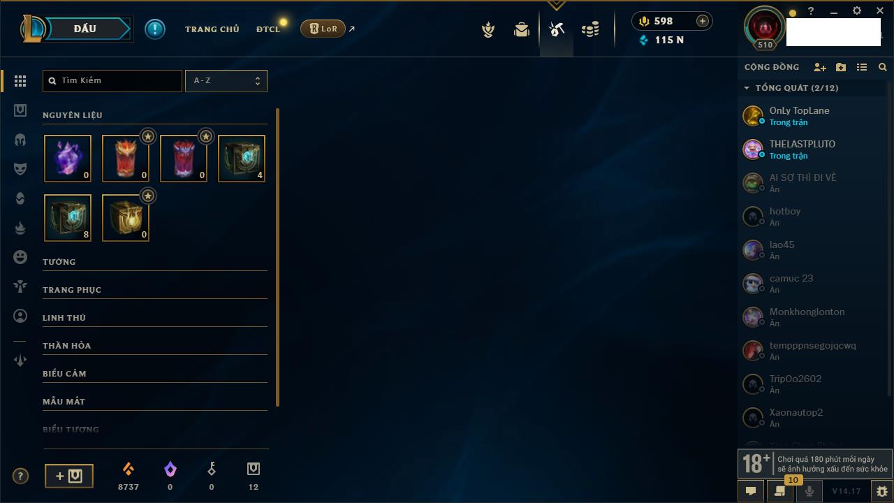 Rank Đơn: Chưa Rank Khung: Chưa có khung Tướng: 172 - Còn 39631 THX Trang Phục: 261 Rank ĐTCL: Chưa Rank Linh Thú: 119