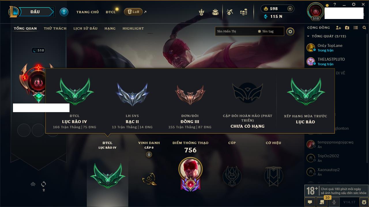 Rank Đơn: Chưa Rank Khung: Bạc Tướng: 172 - Còn 43068 THX Trang Phục: 277 Rank ĐTCL: Chưa Rank Linh Thú: 144