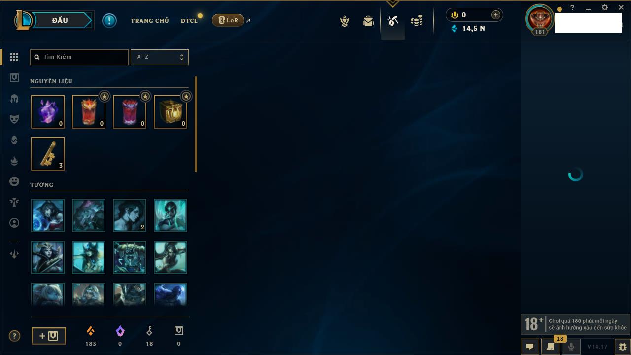 Rank Đơn: Đồng IKhung: Chưa có khungTướng: 171 - Còn 223932 THXTrang Phục: 61Rank ĐTCL: Lục Bảo ILinh Thú: 58