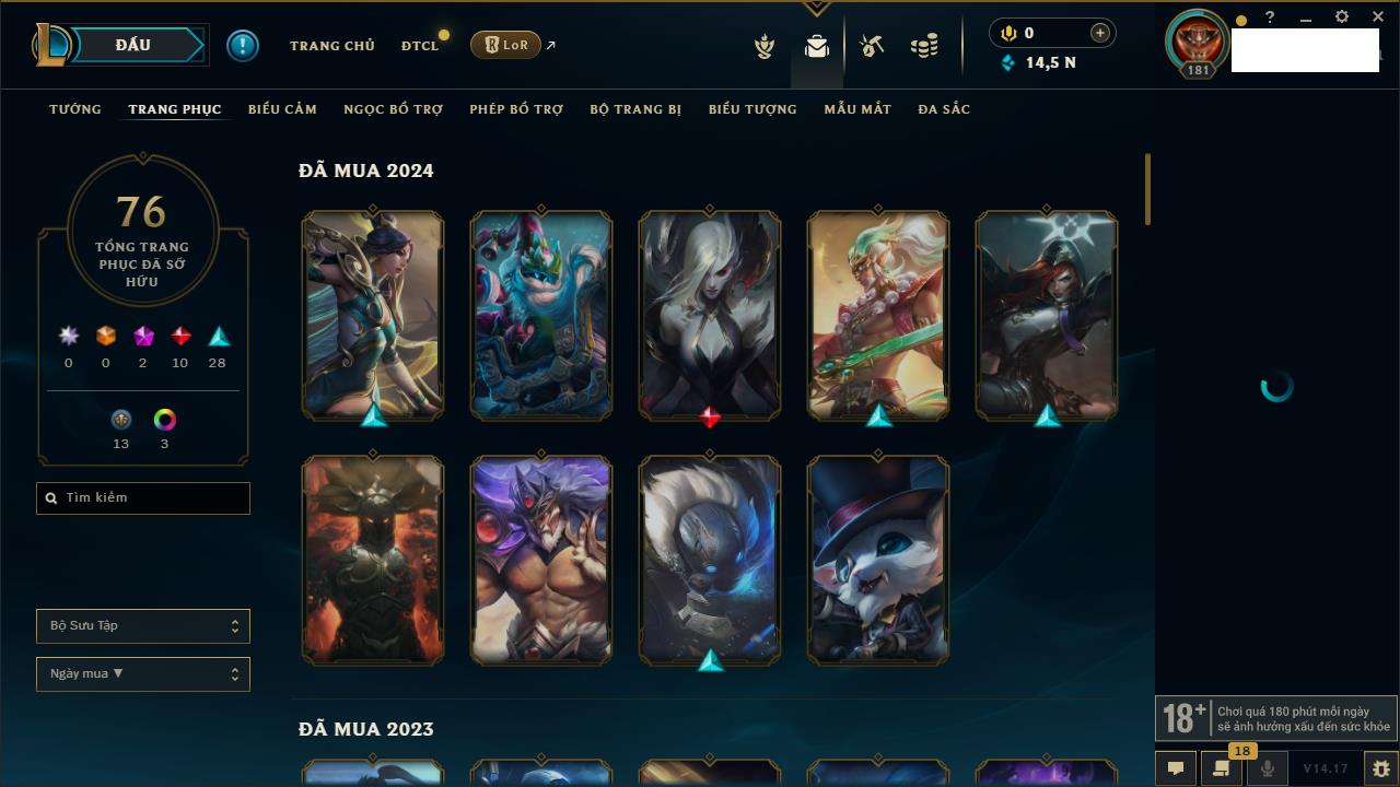 Rank Đơn: Vàng IIIKhung: BạcTướng: 103 - Còn 10252 THXTrang Phục: 7Rank ĐTCL: Chưa RankLinh Thú: 35