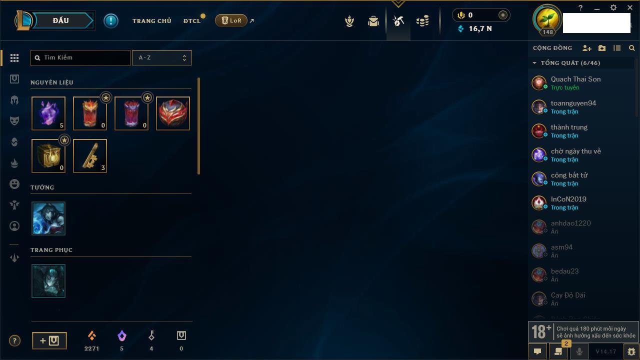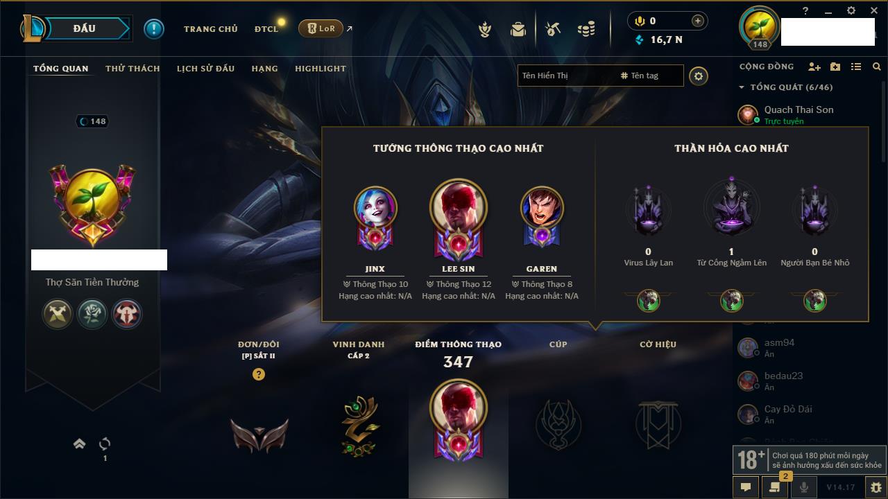 Rank Đơn: Chưa rank mùa nào Khung: Chưa có khung Tướng: 0 - Còn 2000 THX Trang Phục: 0 Rank ĐTCL: Chưa Rank Linh Thú: 14