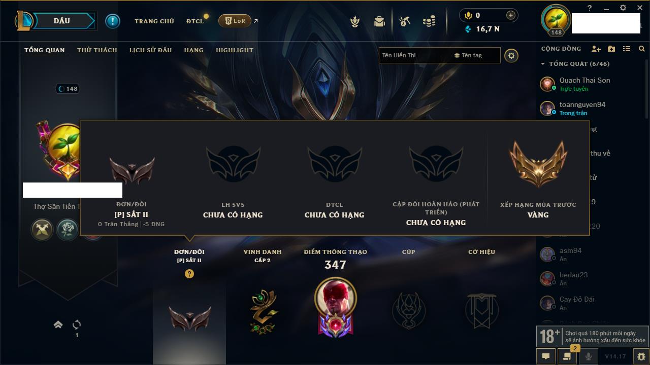 Rank Đơn: Bạc IV Khung: Bạc Tướng: 64 - Còn 5901 THX Trang Phục: 17 Rank ĐTCL: Chưa Rank Linh Thú: 105