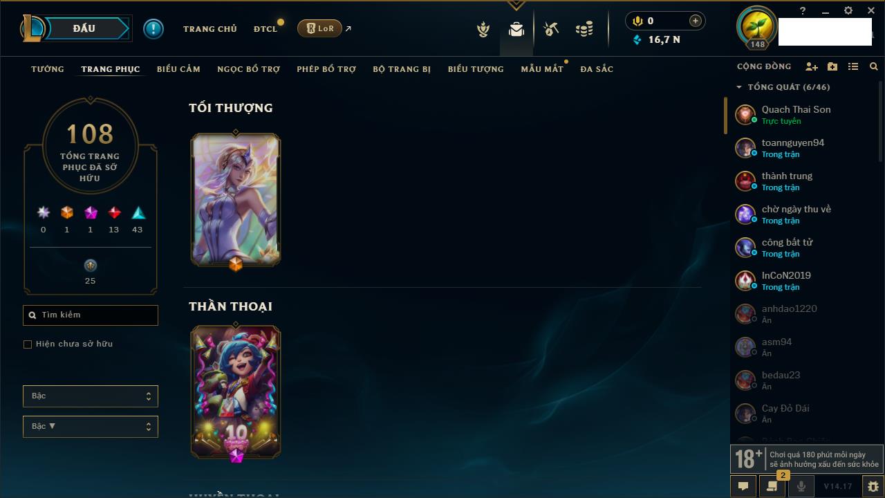 Rank Đơn: Chưa Rank Khung: Chưa có khung Tướng: 161 - Còn 16793 THX Trang Phục: 108 Rank ĐTCL: Chưa Rank Linh Thú: 93