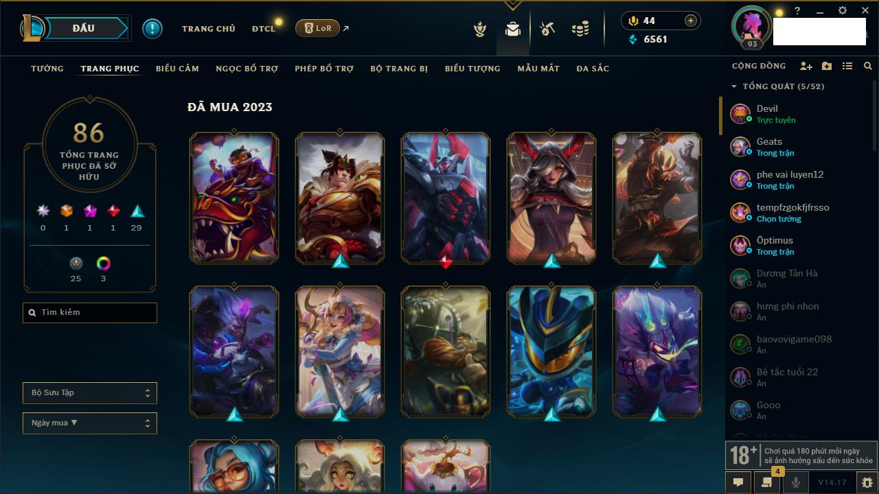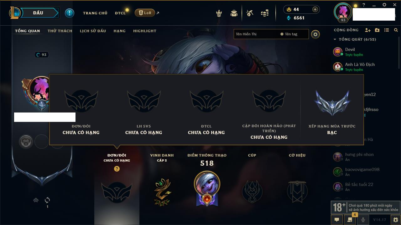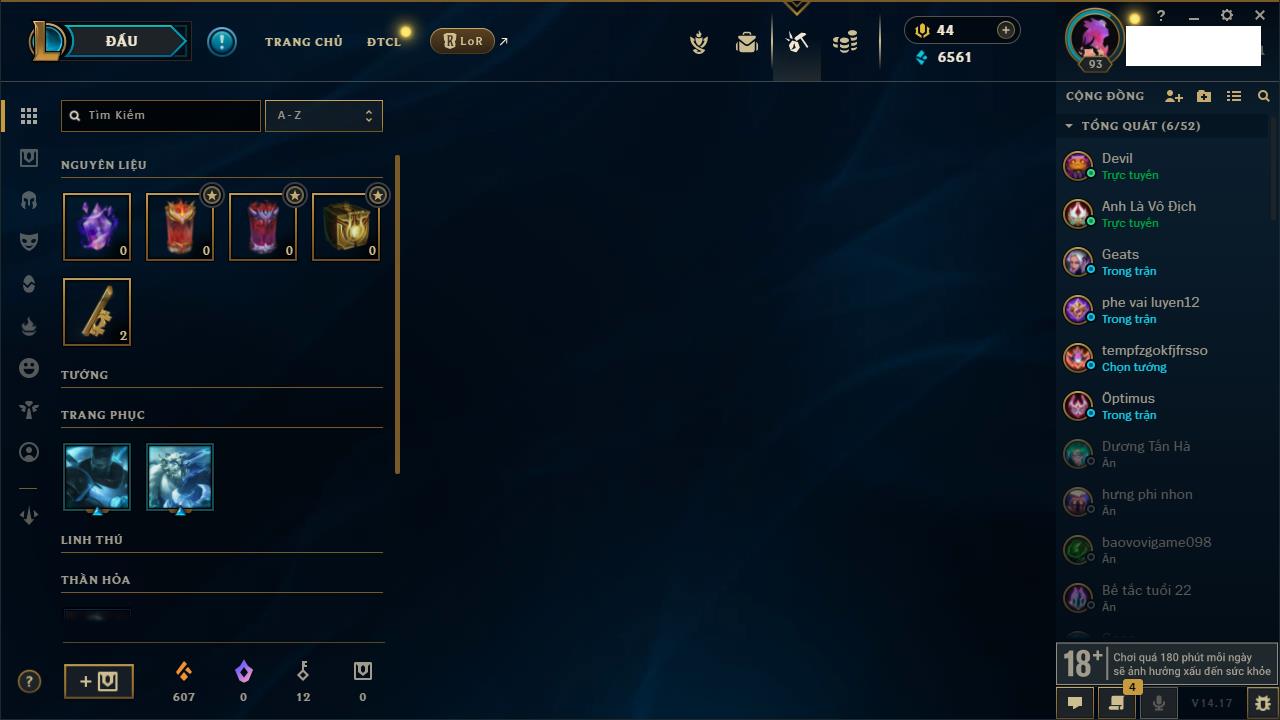 Rank Đơn: Đồng IKhung: Chưa có khungTướng: 171 - Còn 223932 THXTrang Phục: 61Rank ĐTCL: Lục Bảo ILinh Thú: 58