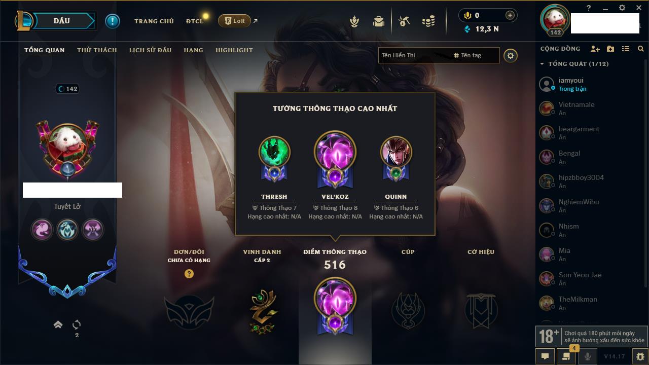 Rank Đơn: Chưa RankKhung: Chưa có khungTướng: 161 - Còn 144228 THXTrang Phục: 179Rank ĐTCL: Chưa RankLinh Thú: 12
