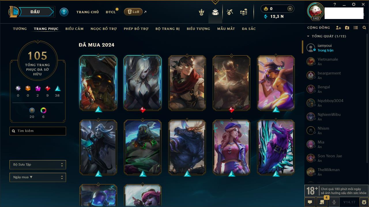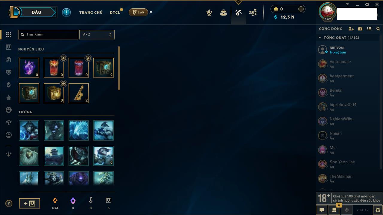 Rank Đơn: Chưa RankKhung: Chưa có khungTướng: 170 - Còn 13795 THXTrang Phục: 75Rank ĐTCL: Chưa RankLinh Thú: 176