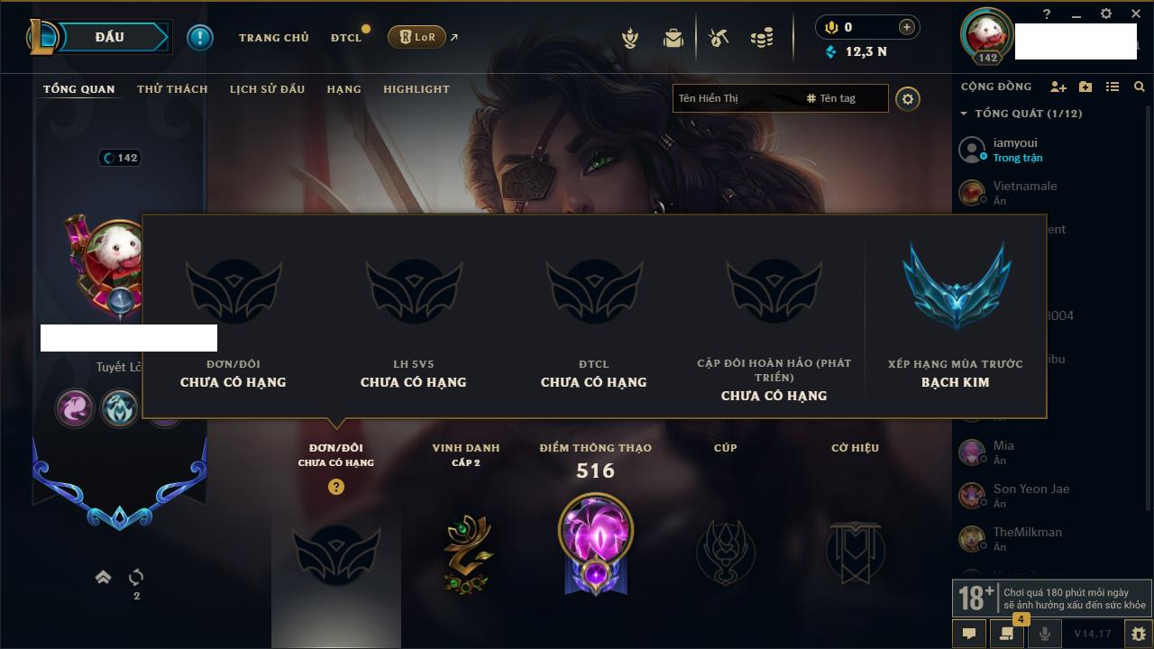 Rank Đơn: Chưa RankKhung: Chưa có khungTướng: 65 - Còn 2075 THXTrang Phục: 10Rank ĐTCL: Chưa RankLinh Thú: 72