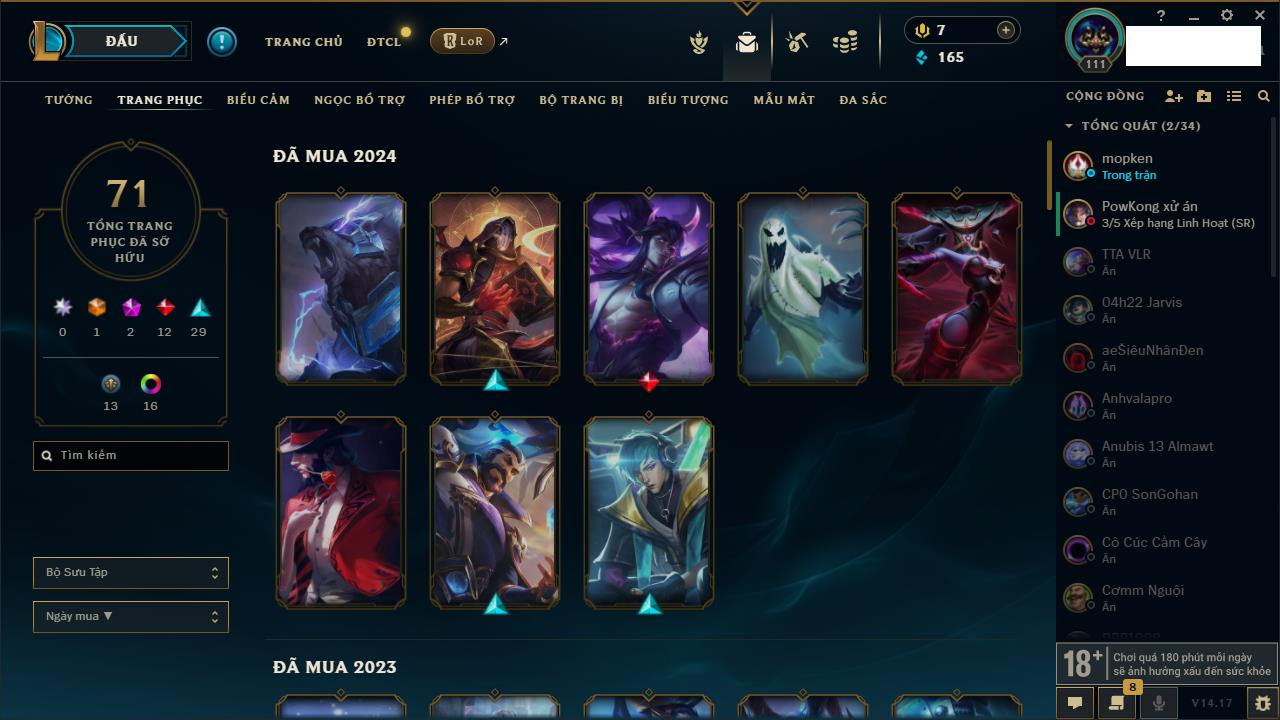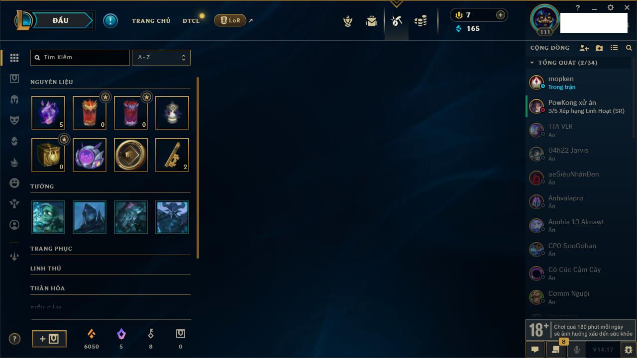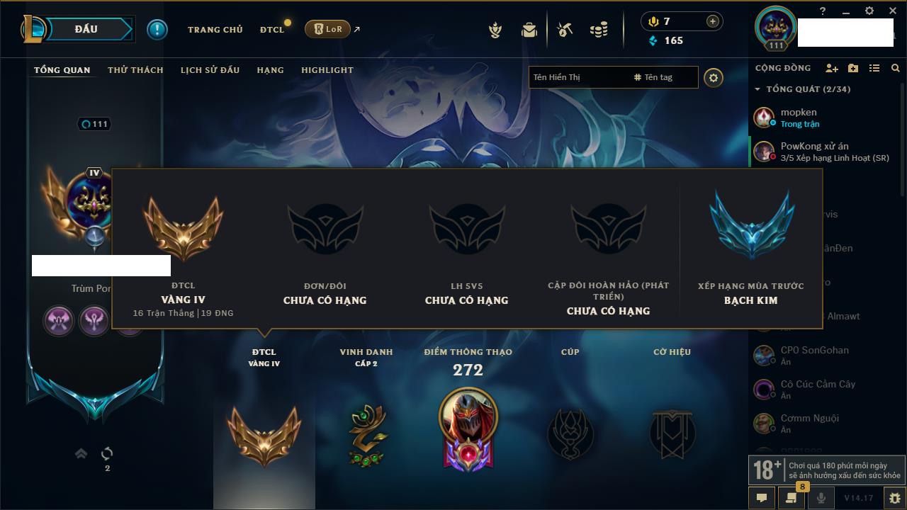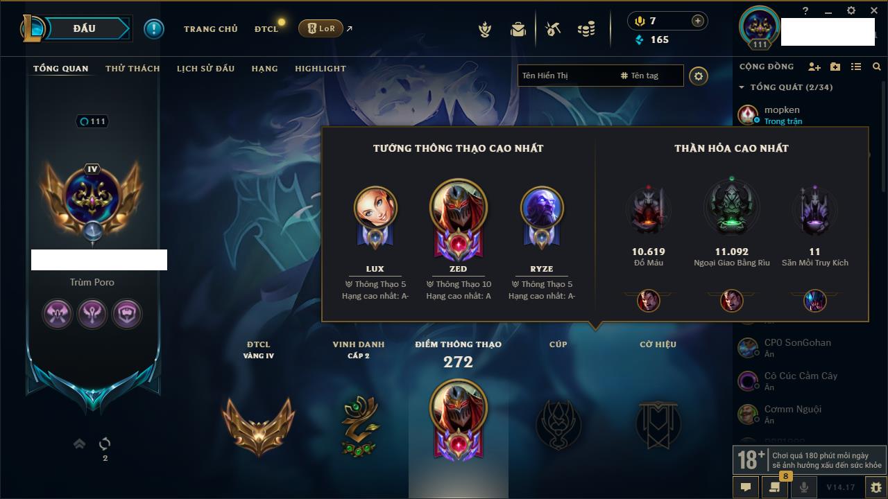 Rank Đơn: Đồng IIIKhung: Chưa có khungTướng: 167 - Còn 22819 THXTrang Phục: 132Rank ĐTCL: Chưa RankLinh Thú: 132