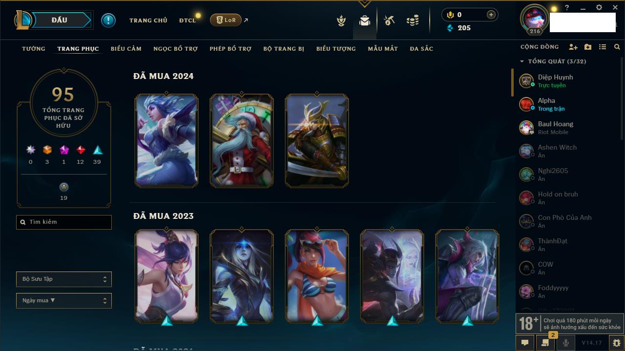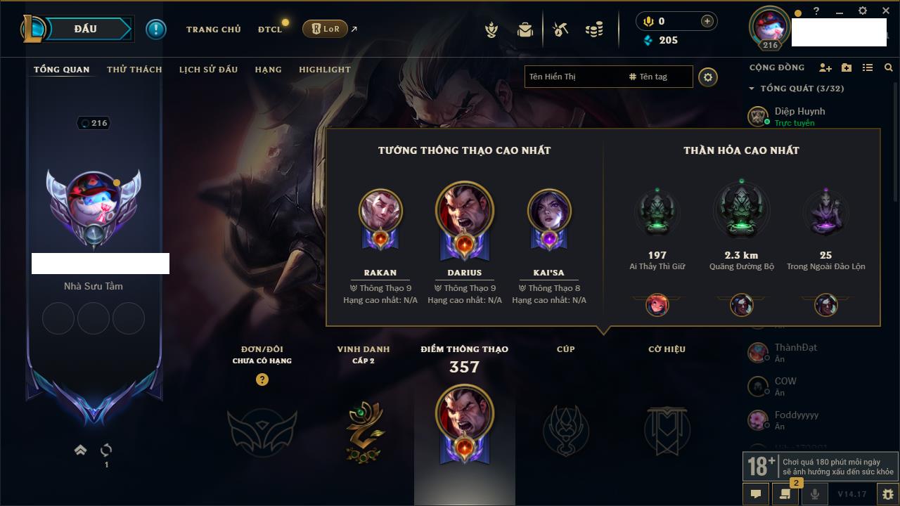 Rank Đơn: Đồng IVKhung: Chưa có khungTướng: 140 - Còn 10800 THXTrang Phục: 19Rank ĐTCL: Chưa RankLinh Thú: 119