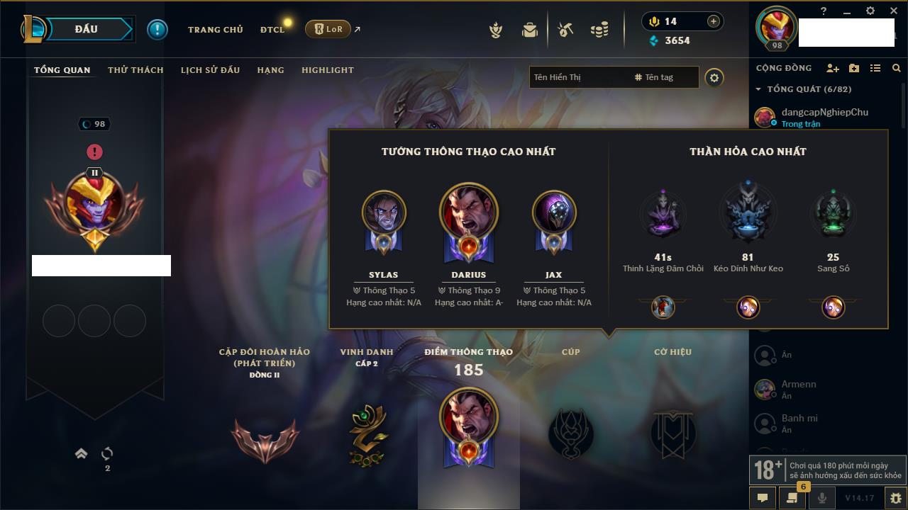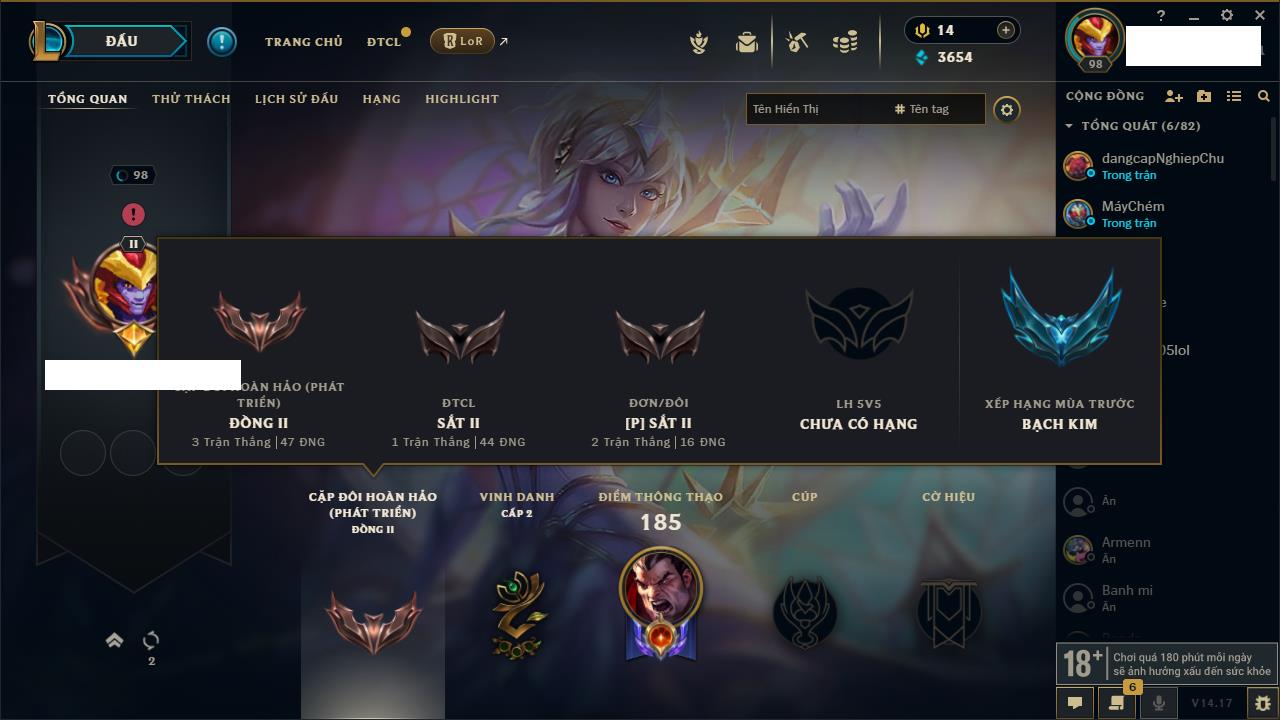 Rank Đơn: Đồng IKhung: Chưa có khungTướng: 171 - Còn 223932 THXTrang Phục: 61Rank ĐTCL: Lục Bảo ILinh Thú: 58
