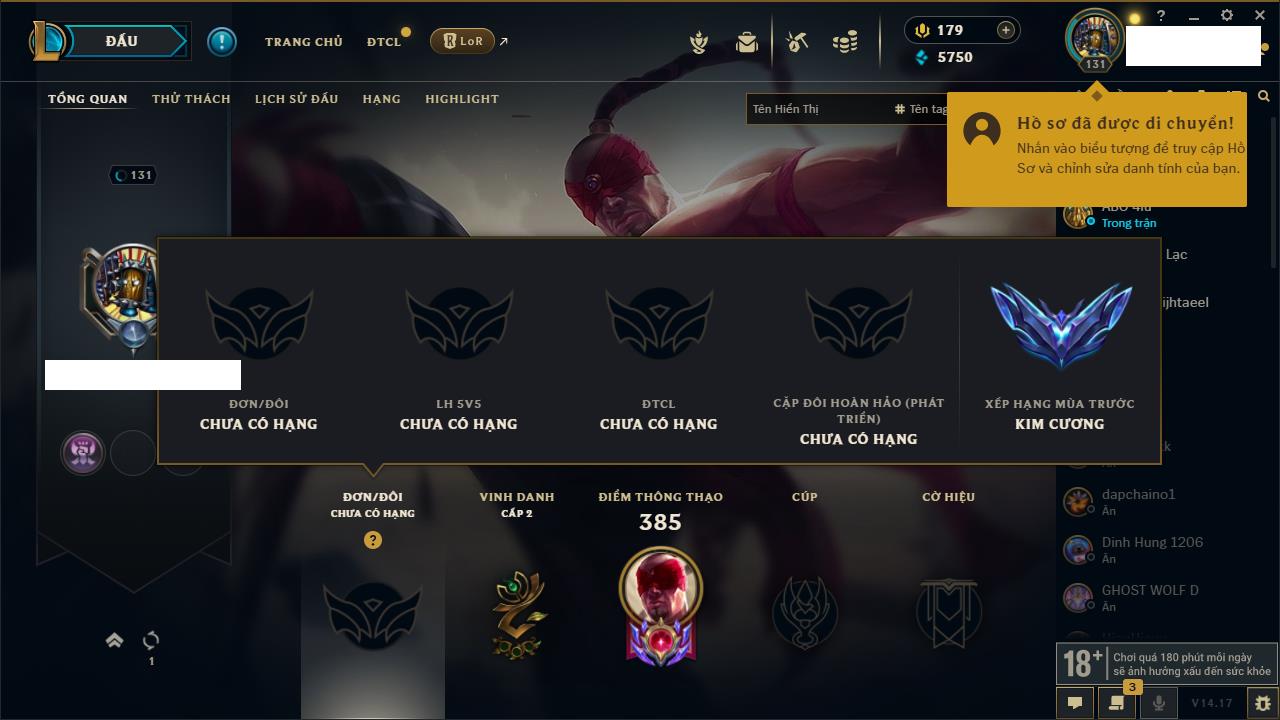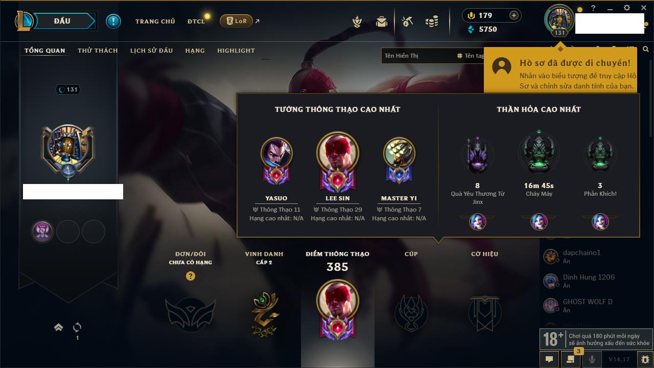 Rank Đơn: Đồng IVKhung: Chưa có khungTướng: 140 - Còn 10800 THXTrang Phục: 19Rank ĐTCL: Chưa RankLinh Thú: 119
