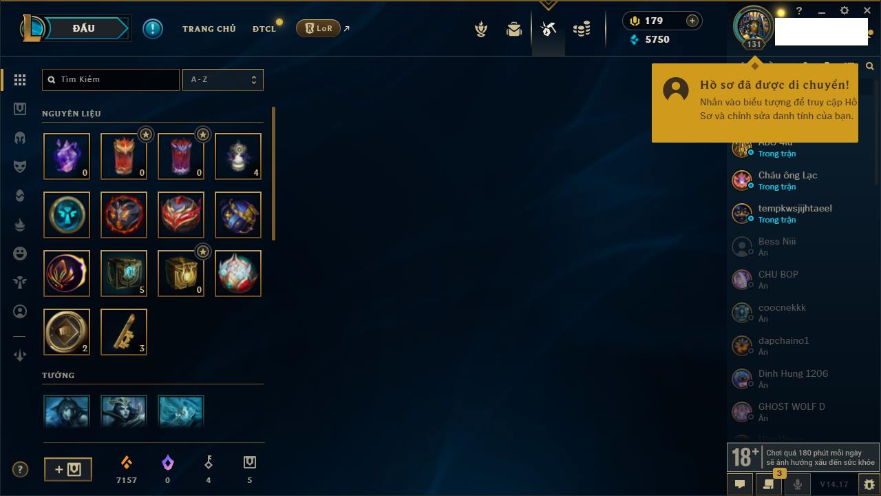 Rank Đơn: Đồng IKhung: Chưa có khungTướng: 171 - Còn 223932 THXTrang Phục: 61Rank ĐTCL: Lục Bảo ILinh Thú: 58