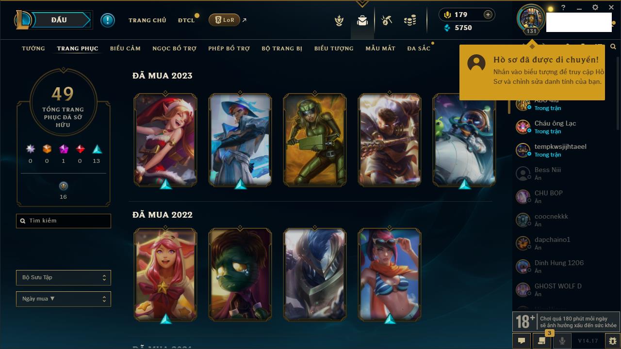 Rank Đơn: Chưa RankKhung: Chưa có khungTướng: 132 - Còn 23973 THXTrang Phục: 94Rank ĐTCL: Chưa RankLinh Thú: 42