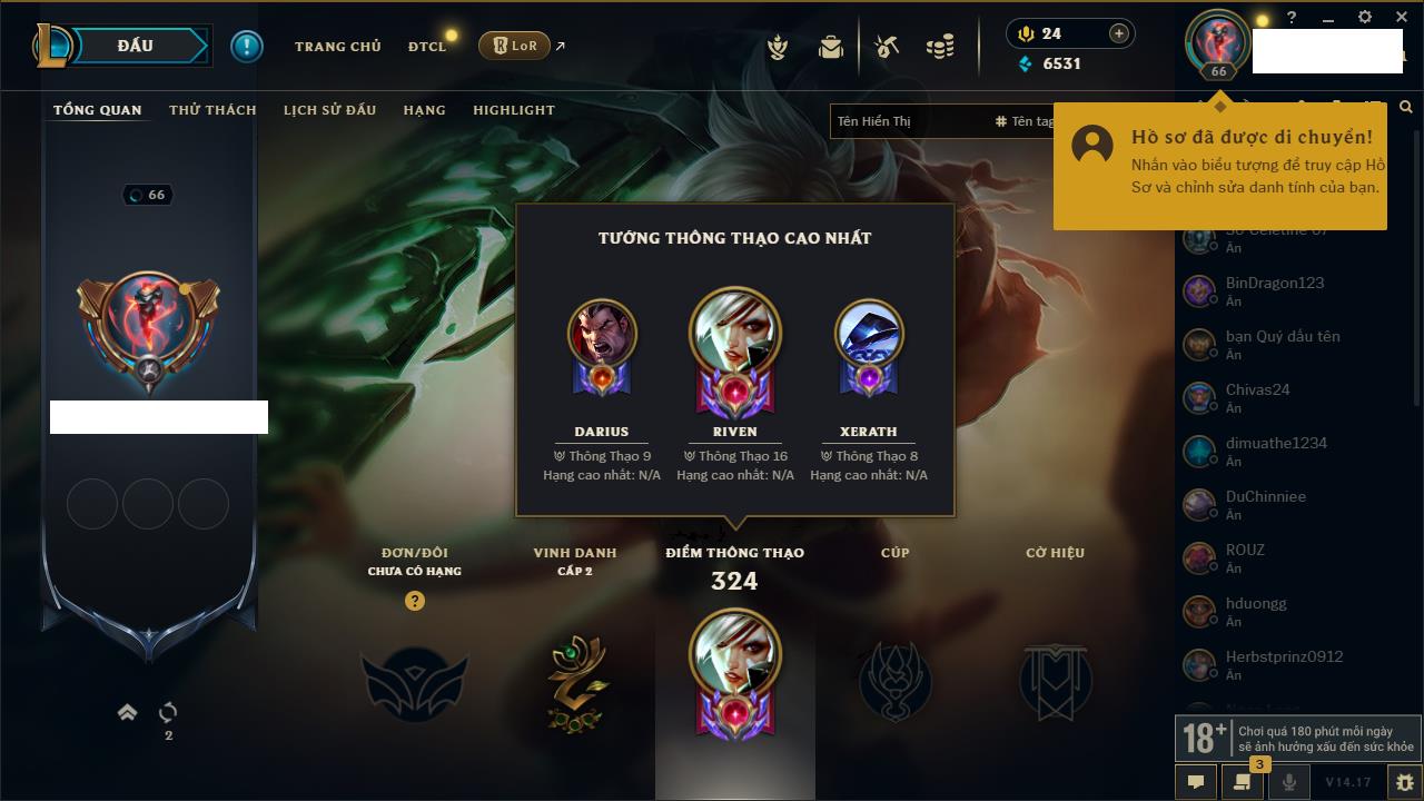 Rank Đơn: Chưa RankKhung: Bạch kimTướng: 172 - Còn 81 THXTrang Phục: 226Rank ĐTCL: Chưa RankLinh Thú: 193