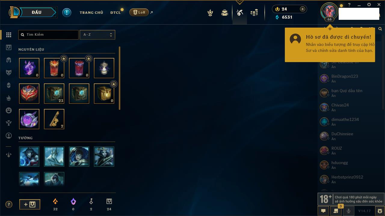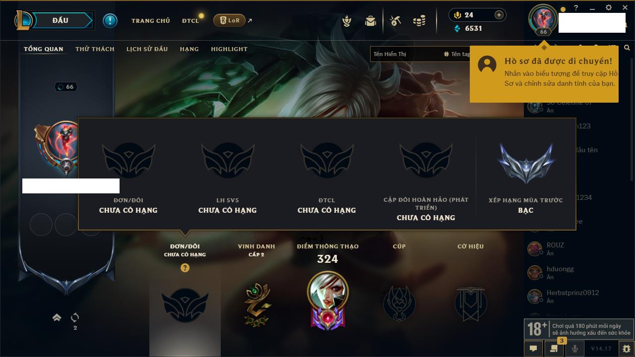 Rank Đơn: Chưa RankKhung: Bạch kimTướng: 170 - Còn 146400 THXTrang Phục: 225Rank ĐTCL: Chưa RankLinh Thú: 134