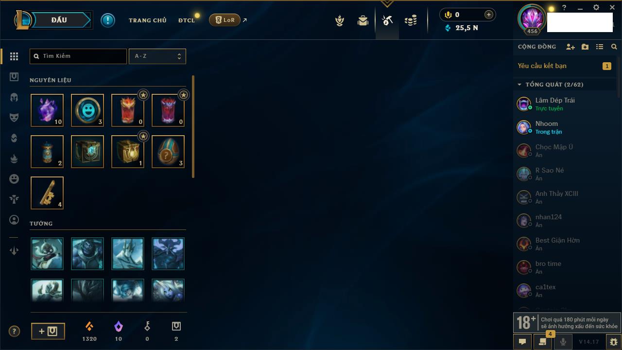 Rank Đơn: Vàng IVKhung: VàngTướng: 171 - Còn 660284 THXTrang Phục: 199Rank ĐTCL: Chưa RankLinh Thú: 34