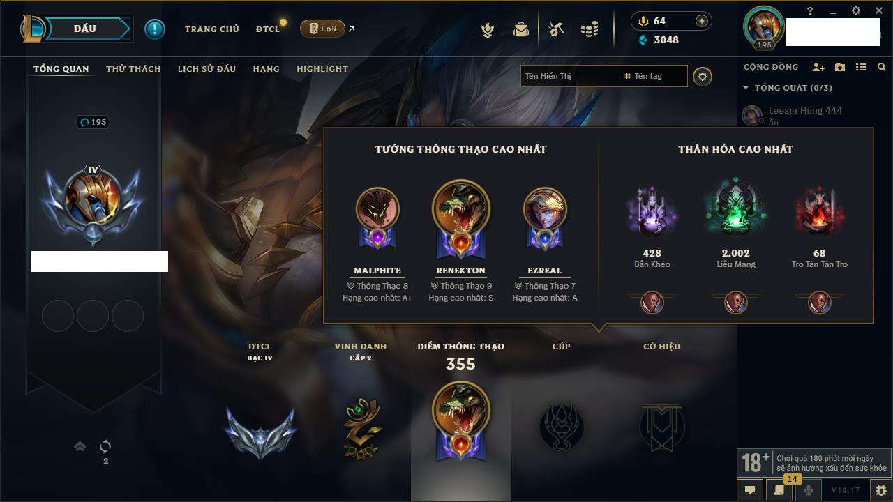 Rank Đơn: Sắt IIIKhung: SắtTướng: 171 - Còn 62070 THXTrang Phục: 198Rank ĐTCL: Bạch Kim IIILinh Thú: 237