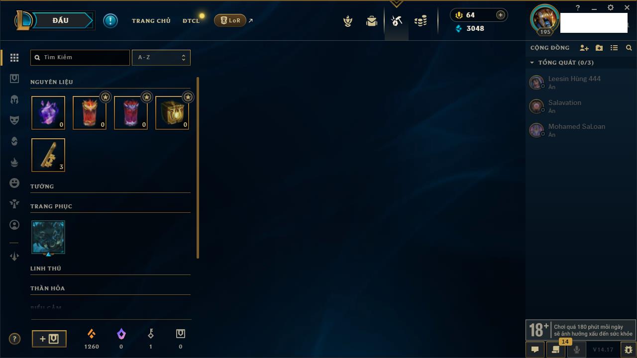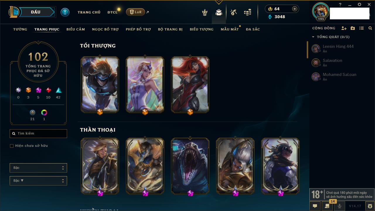 Rank Đơn: Vàng IIIKhung: Bạch kimTướng: 171 - Còn 98230 THXTrang Phục: 235Rank ĐTCL: Vàng IVLinh Thú: 59