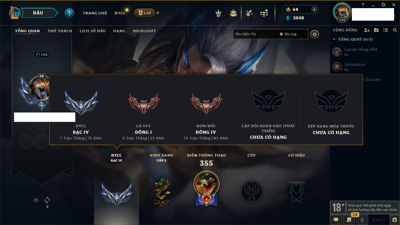 Rank Đơn: Bạc IVKhung: BạcTướng: 171 - Còn 173918 THXTrang Phục: 233Rank ĐTCL: Lục Bảo IIILinh Thú: 26