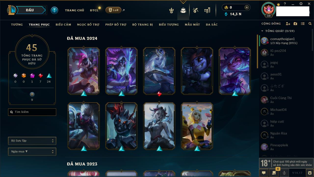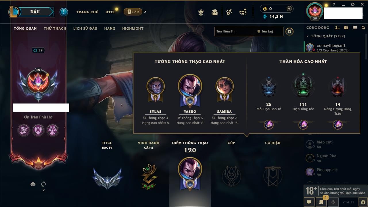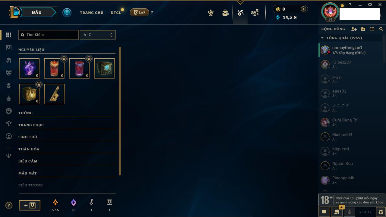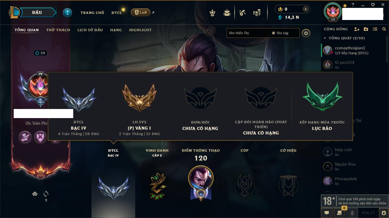 Rank Đơn: Vàng IVKhung: BạcTướng: 167 - Còn 16342 THXTrang Phục: 159Rank ĐTCL: Chưa RankLinh Thú: 88