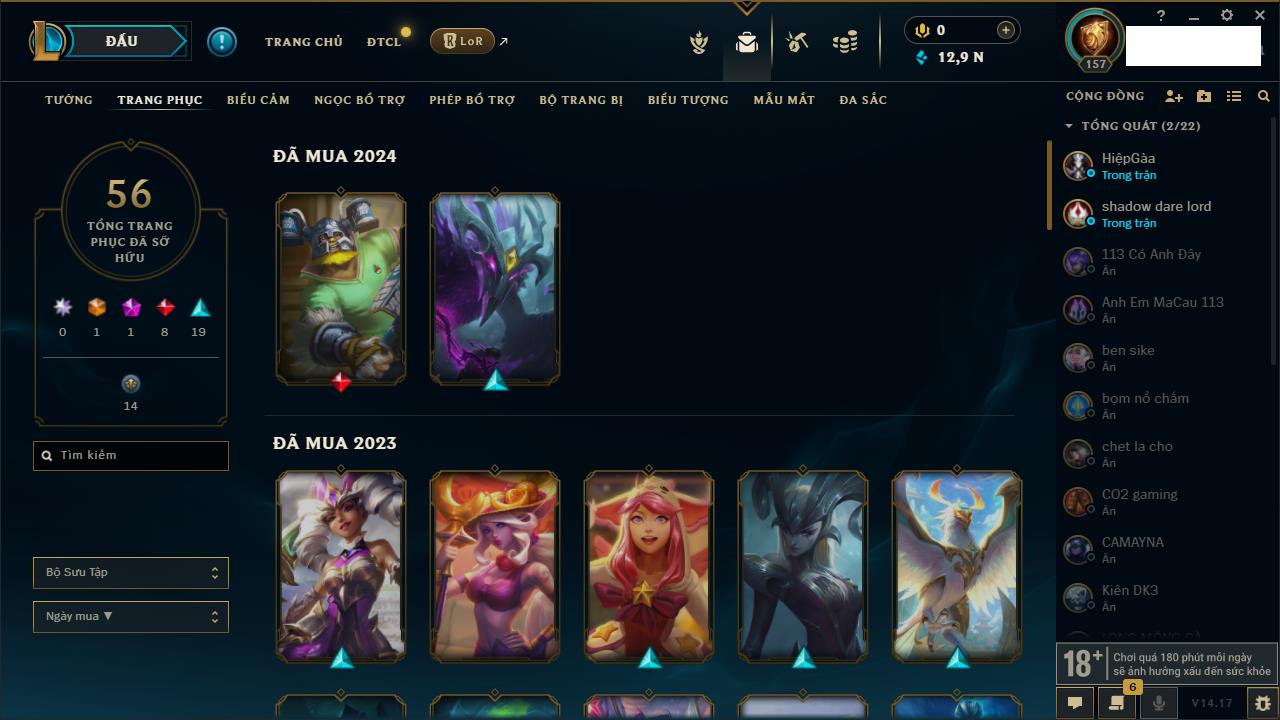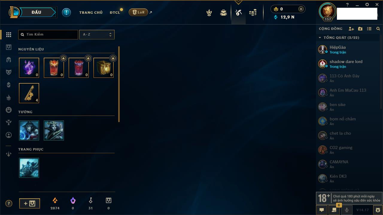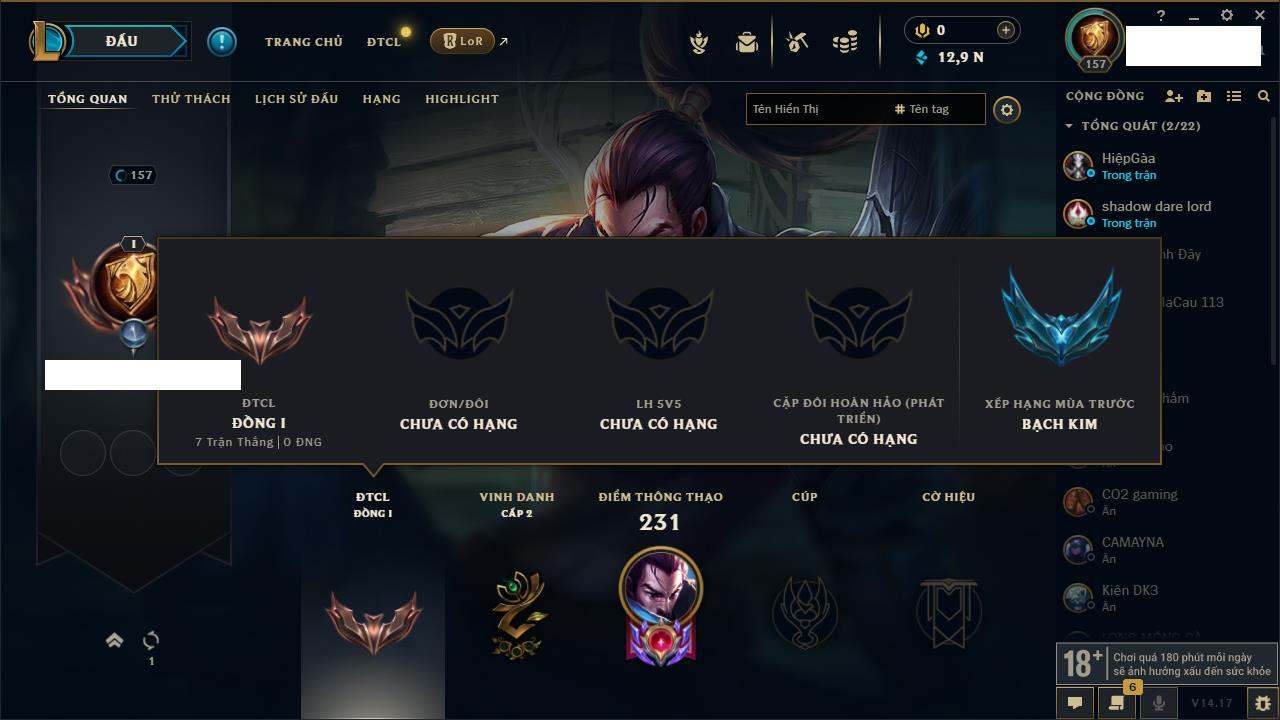 Rank Đơn: Đồng IVKhung: Chưa có khungTướng: 140 - Còn 10800 THXTrang Phục: 19Rank ĐTCL: Chưa RankLinh Thú: 119