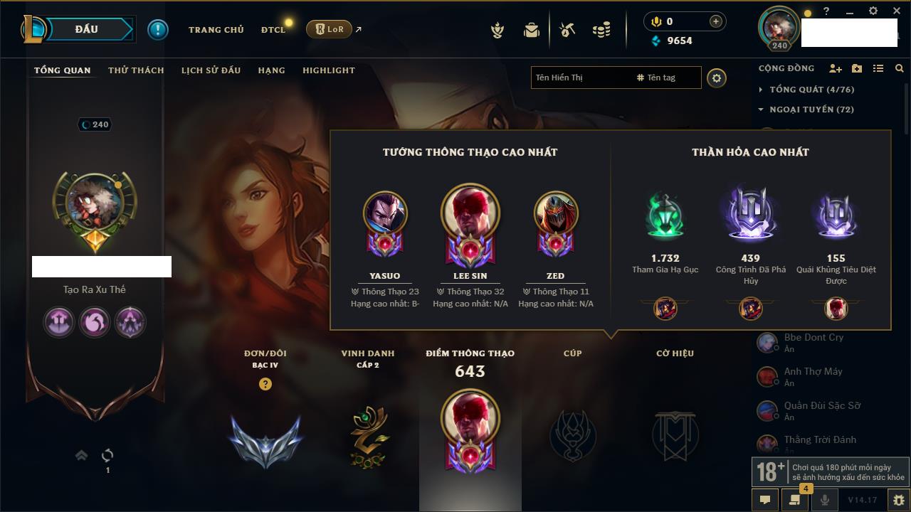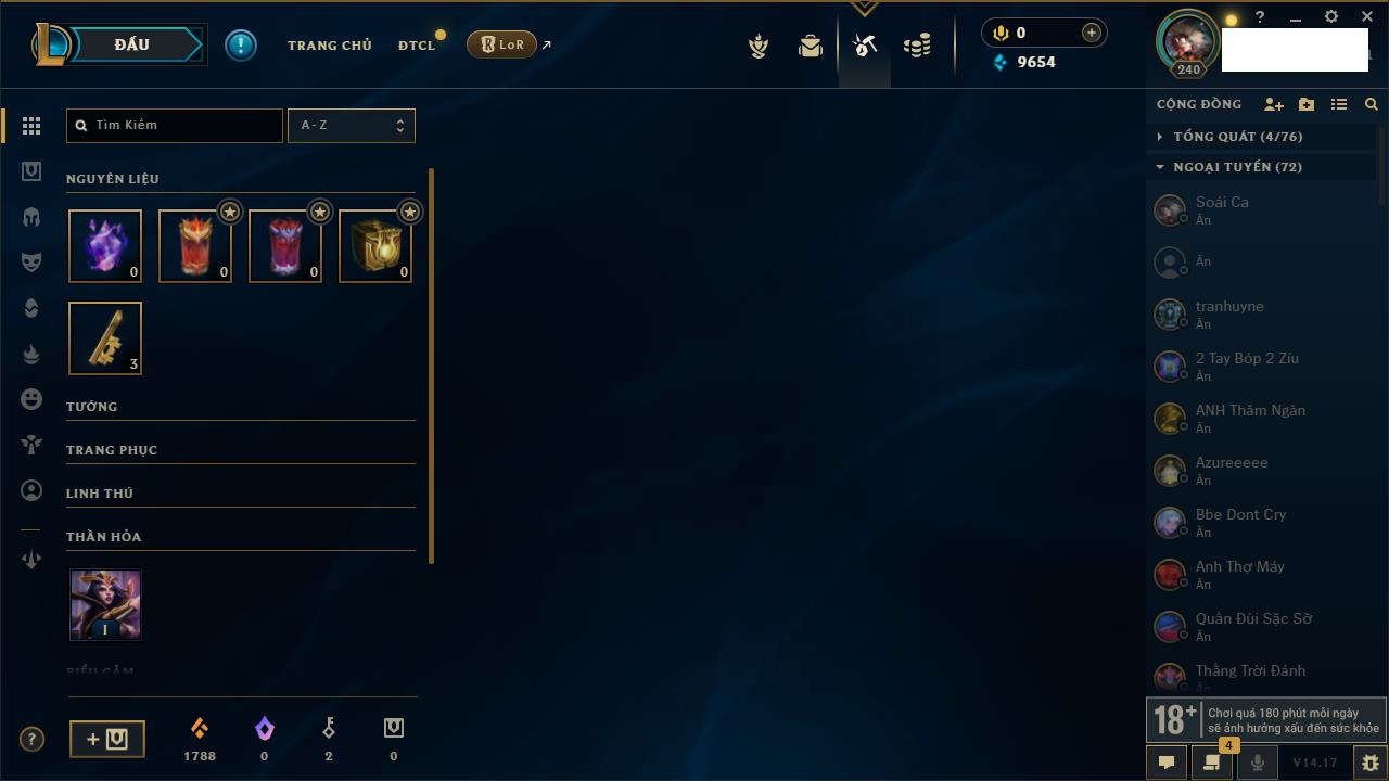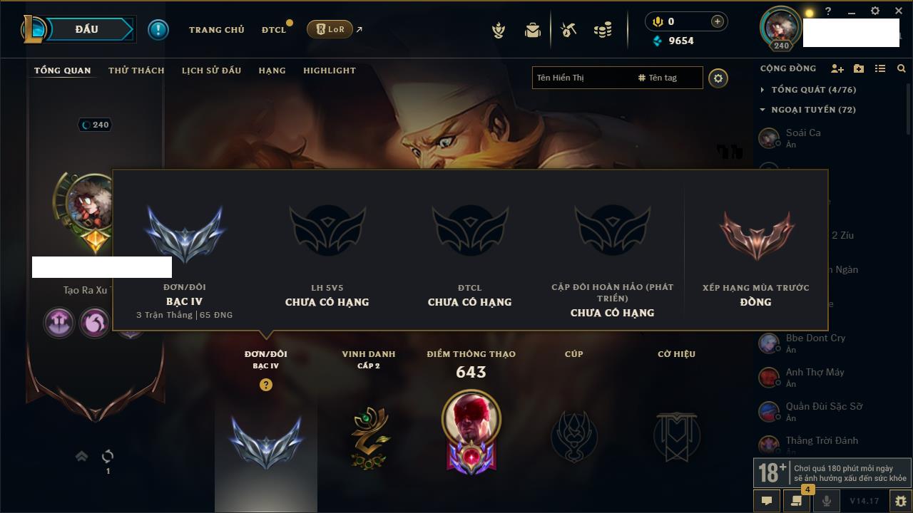 Rank Đơn: Bạc IIIKhung: BạcTướng: 171 - Còn 51045 THXTrang Phục: 220Rank ĐTCL: Sắt IILinh Thú: 141