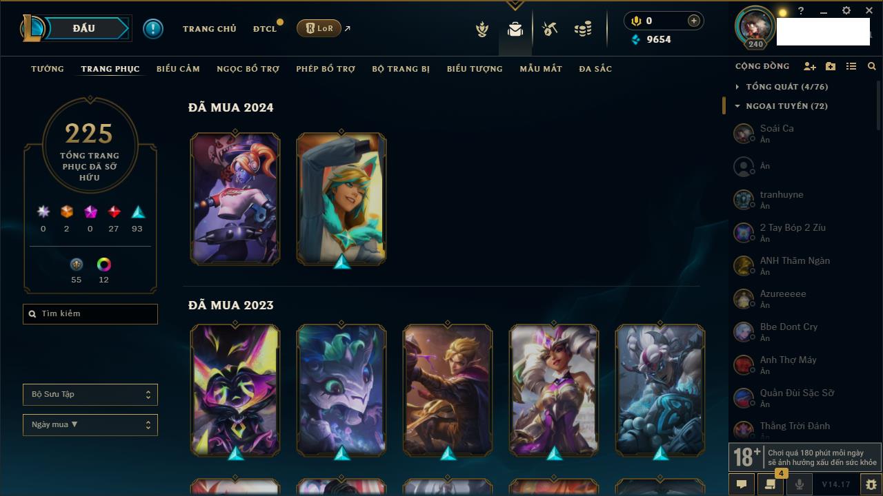 Rank Đơn: Vàng IKhung: VàngTướng: 171 - Còn 117995 THXTrang Phục: 199Rank ĐTCL: Lục Bảo IILinh Thú: 74