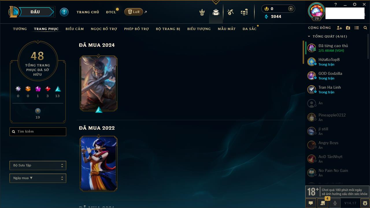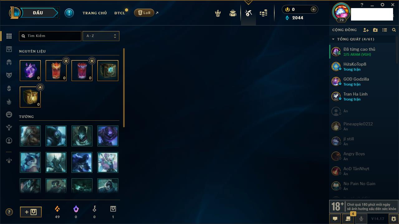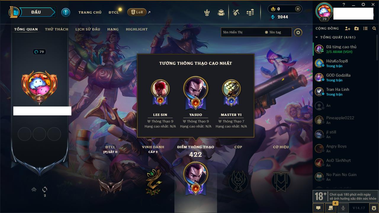 Rank Đơn: Đồng IVKhung: Chưa có khungTướng: 89 - Còn 589 THXTrang Phục: 9Rank ĐTCL: Chưa RankLinh Thú: 27