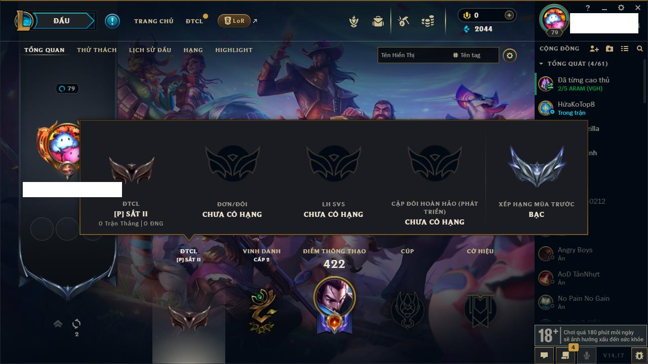 Rank Đơn: Chưa rank mùa nàoKhung: Chưa có khungTướng: 0 - Còn 9000 THXTrang Phục: 0Rank ĐTCL: Bạc IILinh Thú: 13