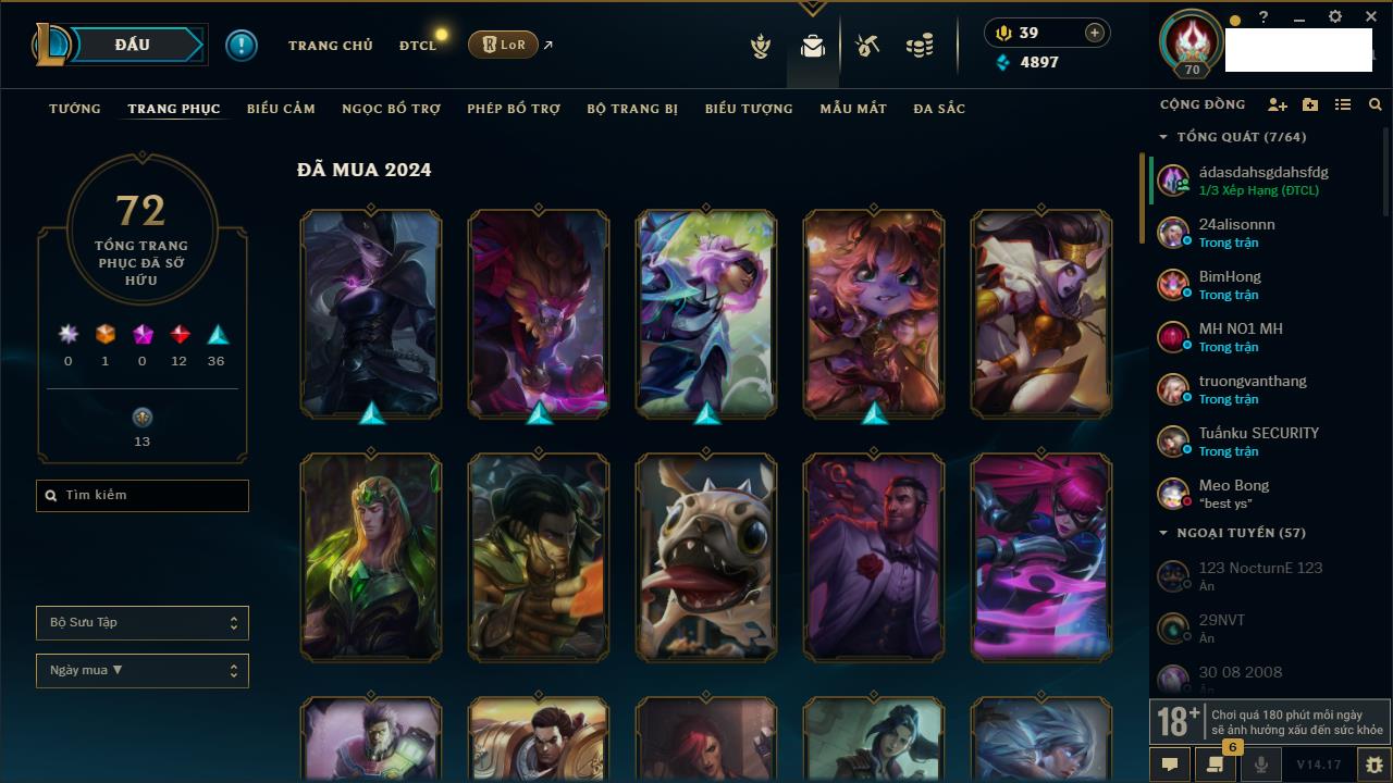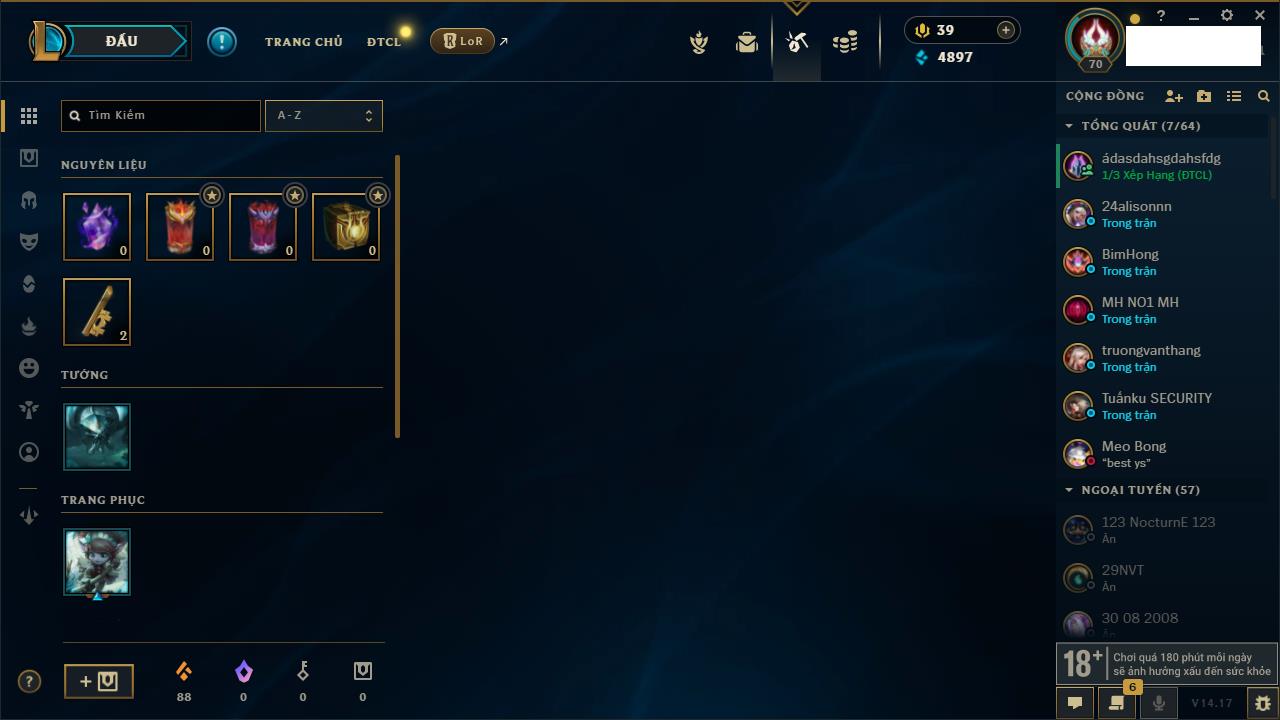 Rank Đơn: Vàng IVKhung: BạcTướng: 167 - Còn 16342 THXTrang Phục: 159Rank ĐTCL: Chưa RankLinh Thú: 88
