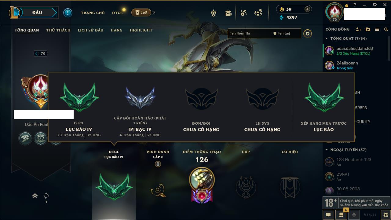 Rank Đơn: Bạc IIKhung: ĐồngTướng: 170 - Còn 270030 THXTrang Phục: 95Rank ĐTCL: Bạch Kim IVLinh Thú: 145