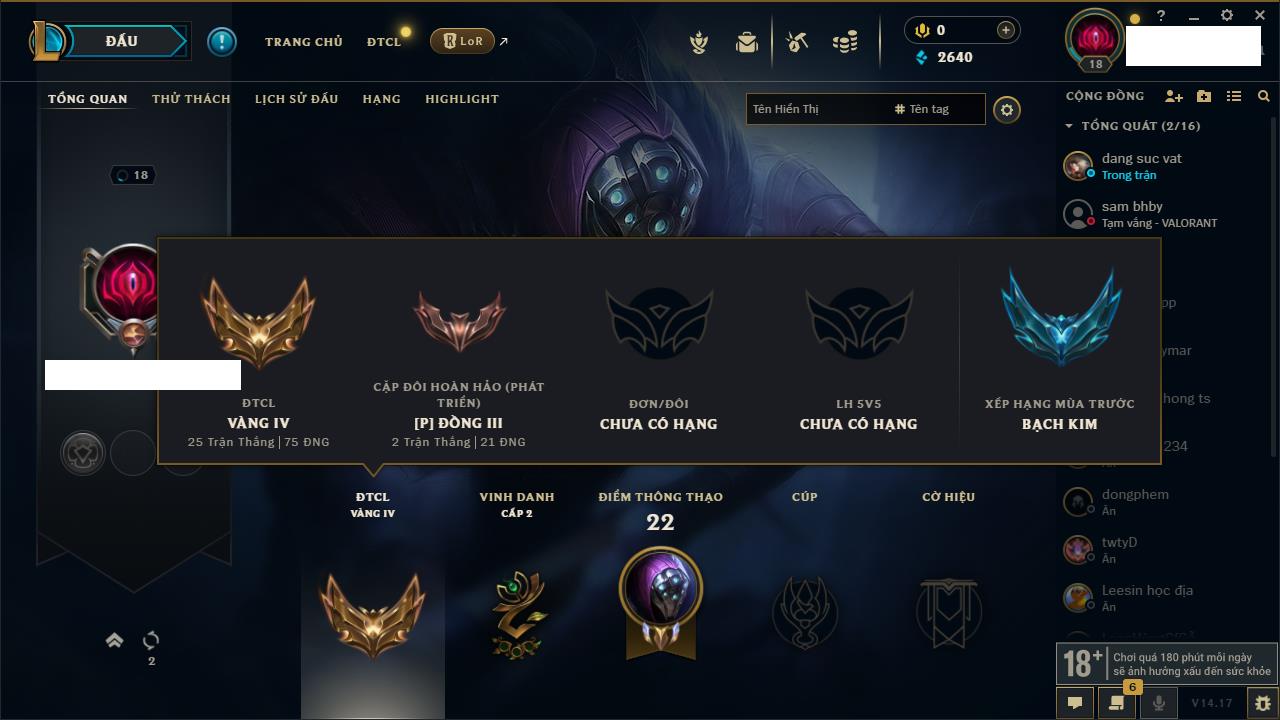 Rank Đơn: Bạch Kim IVKhung: Bạch kimTướng: 171 - Còn 154285 THXTrang Phục: 169Rank ĐTCL: Bạch Kim IILinh Thú: 60