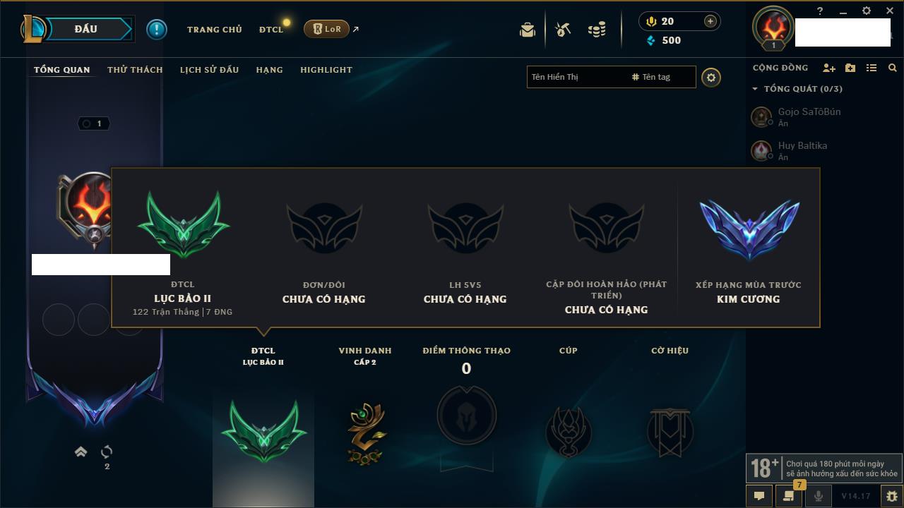Rank Đơn: Chưa rank mùa nàoKhung: Chưa có khungTướng: 4 - Còn 12000 THXTrang Phục: 0Rank ĐTCL: Bạch Kim IIILinh Thú: 20