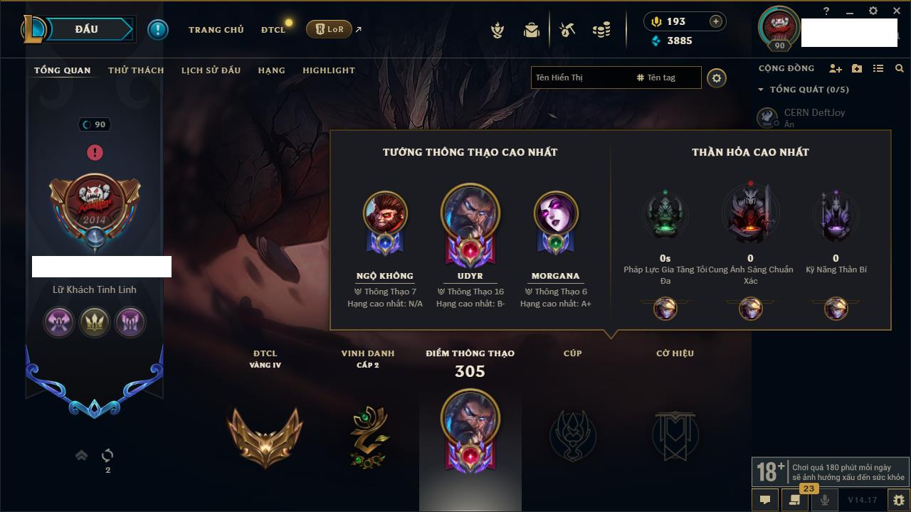 Rank Đơn: Bạc IVKhung: BạcTướng: 76 - Còn 1316 THXTrang Phục: 14Rank ĐTCL: Vàng IILinh Thú: 96