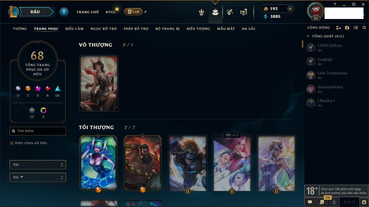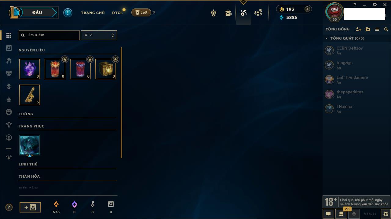 Rank Đơn: Sắt IIIKhung: Chưa có khungTướng: 77 - Còn 8133 THXTrang Phục: 11Rank ĐTCL: Bạch Kim IVLinh Thú: 108