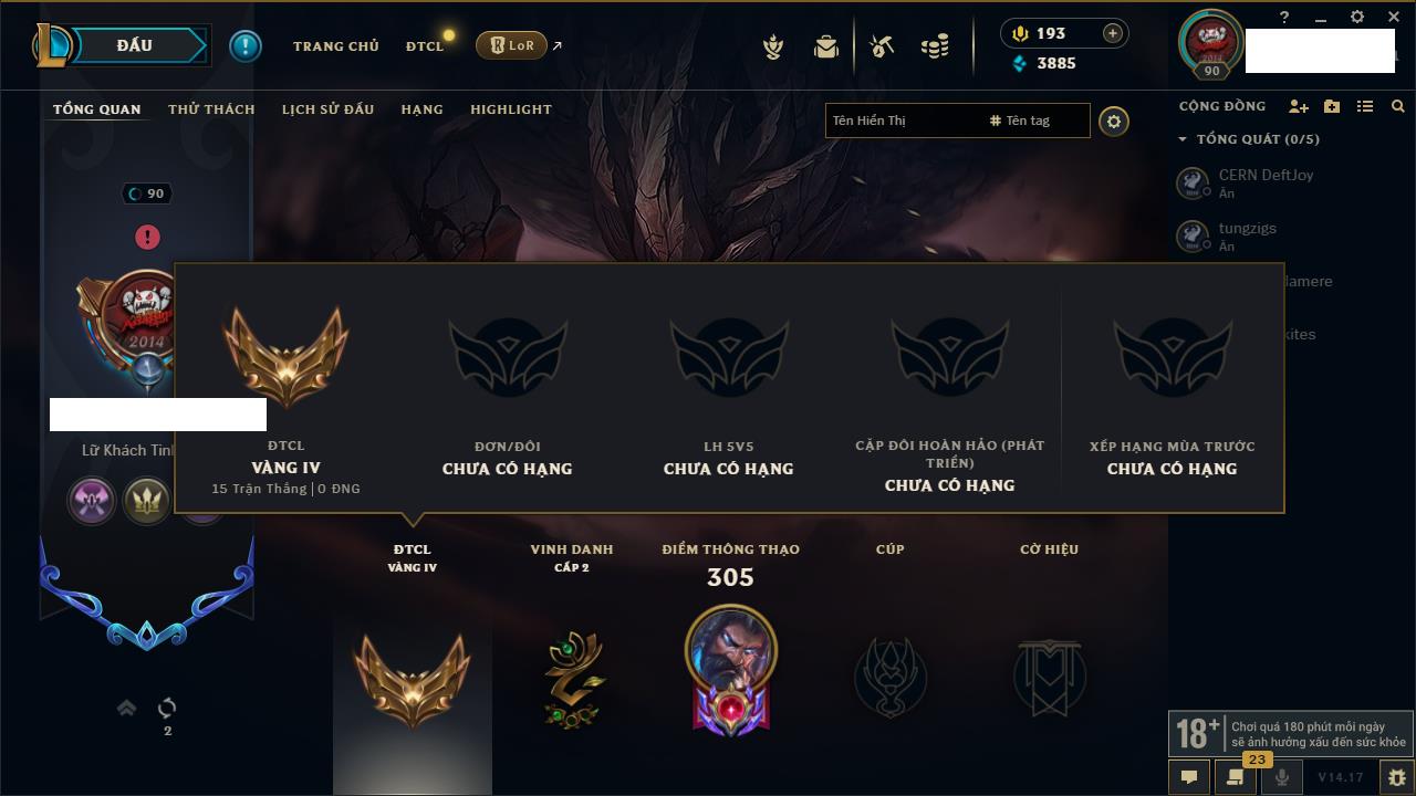 Rank Đơn: Vàng IIIKhung: VàngTướng: 77 - Còn 21172 THXTrang Phục: 8Rank ĐTCL: Kim Cương IIILinh Thú: 23