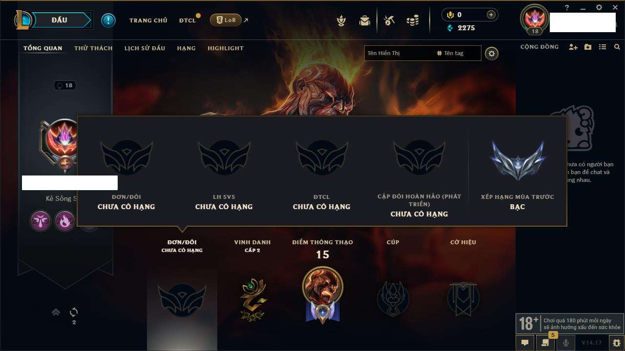 Rank Đơn: Chưa rank mùa nàoKhung: Chưa có khungTướng: 20 - Còn 2091 THXTrang Phục: 1Rank ĐTCL: Chưa RankLinh Thú: 4