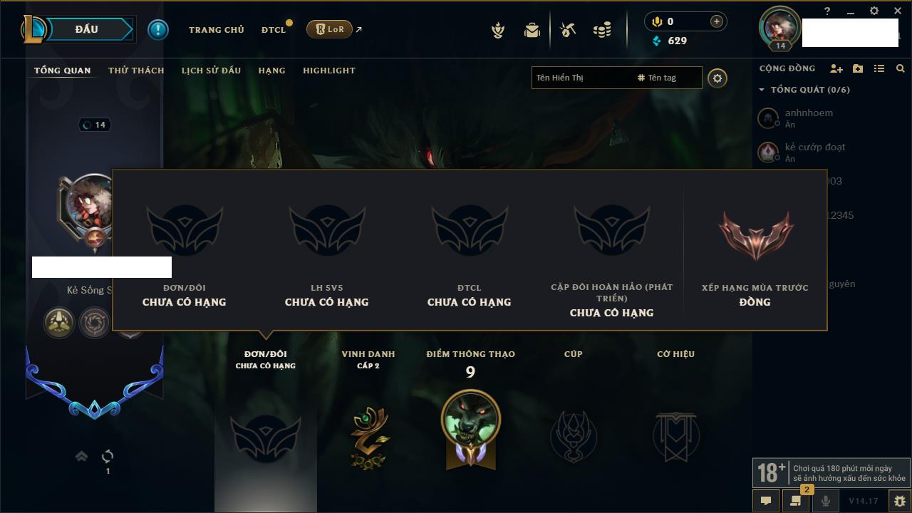 Rank Đơn: Chưa rank mùa nàoKhung: Chưa có khungTướng: 28 - Còn 5900 THXTrang Phục: 0Rank ĐTCL: Chưa RankLinh Thú: 2
