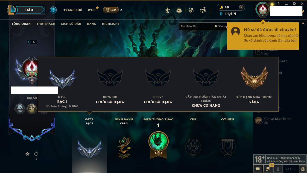 Rank Đơn: Chưa rank mùa nàoKhung: Chưa có khungTướng: 0 - Còn 4000 THXTrang Phục: 0Rank ĐTCL: Đồng ILinh Thú: 18