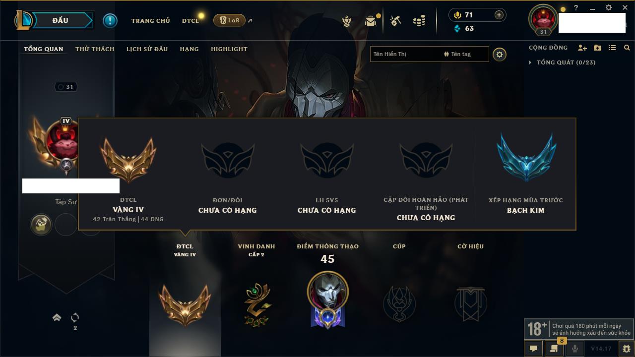 Rank Đơn: Chưa rank mùa nàoKhung: Chưa có khungTướng: 38 - Còn 6280 THXTrang Phục: 2Rank ĐTCL: Chưa RankLinh Thú: 50