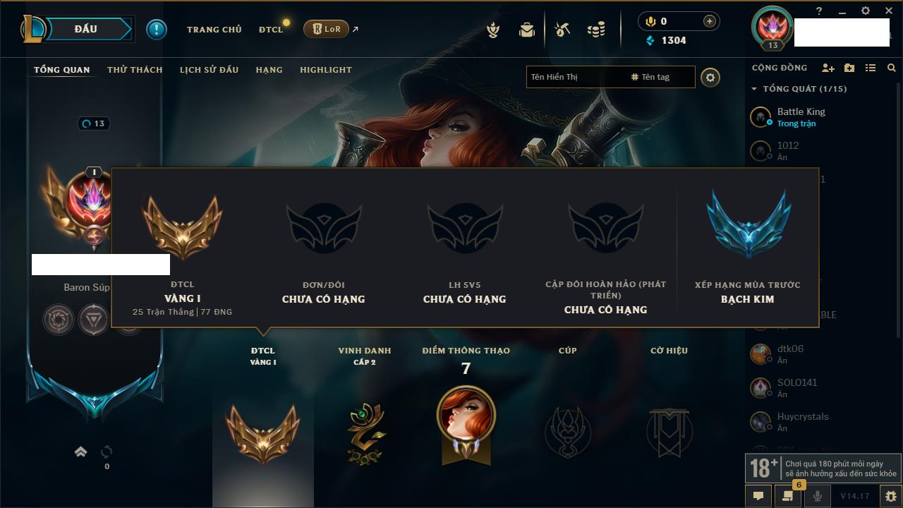 Rank Đơn: Chưa rank mùa nàoKhung: Chưa có khungTướng: 0 - Còn 3000 THXTrang Phục: 0Rank ĐTCL: Bạch Kim IVLinh Thú: 11
