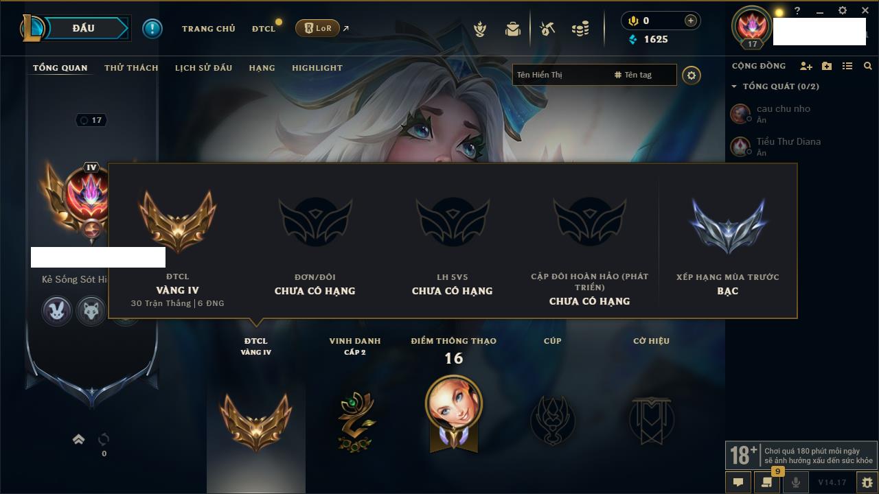 Rank Đơn: Chưa rank mùa nàoKhung: Chưa có khungTướng: 17 - Còn 150 THXTrang Phục: 0Rank ĐTCL: Chưa RankLinh Thú: 10