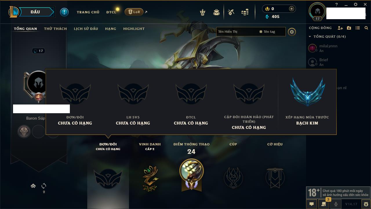 Rank Đơn: Chưa Rank Khung: Vàng Tướng: 171 - Còn 159339 THX Trang Phục: 218 Rank ĐTCL: Chưa Rank Linh Thú: 151