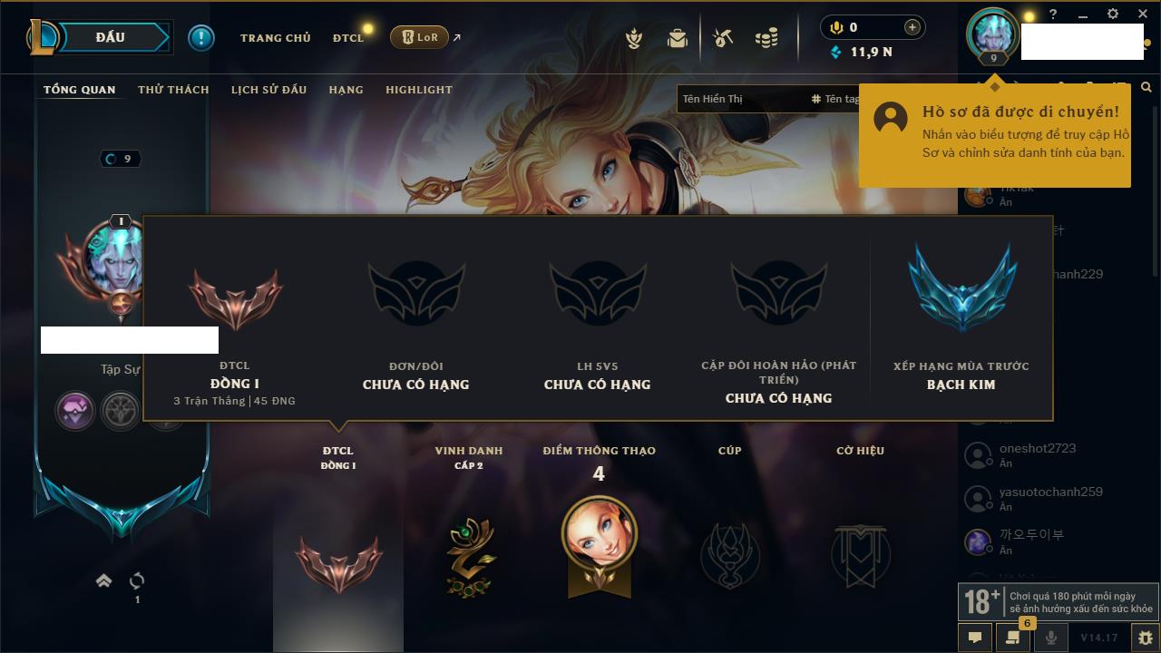 Rank Đơn: Chưa rank mùa nàoKhung: Chưa có khungTướng: 20 - Còn 2091 THXTrang Phục: 1Rank ĐTCL: Chưa RankLinh Thú: 4