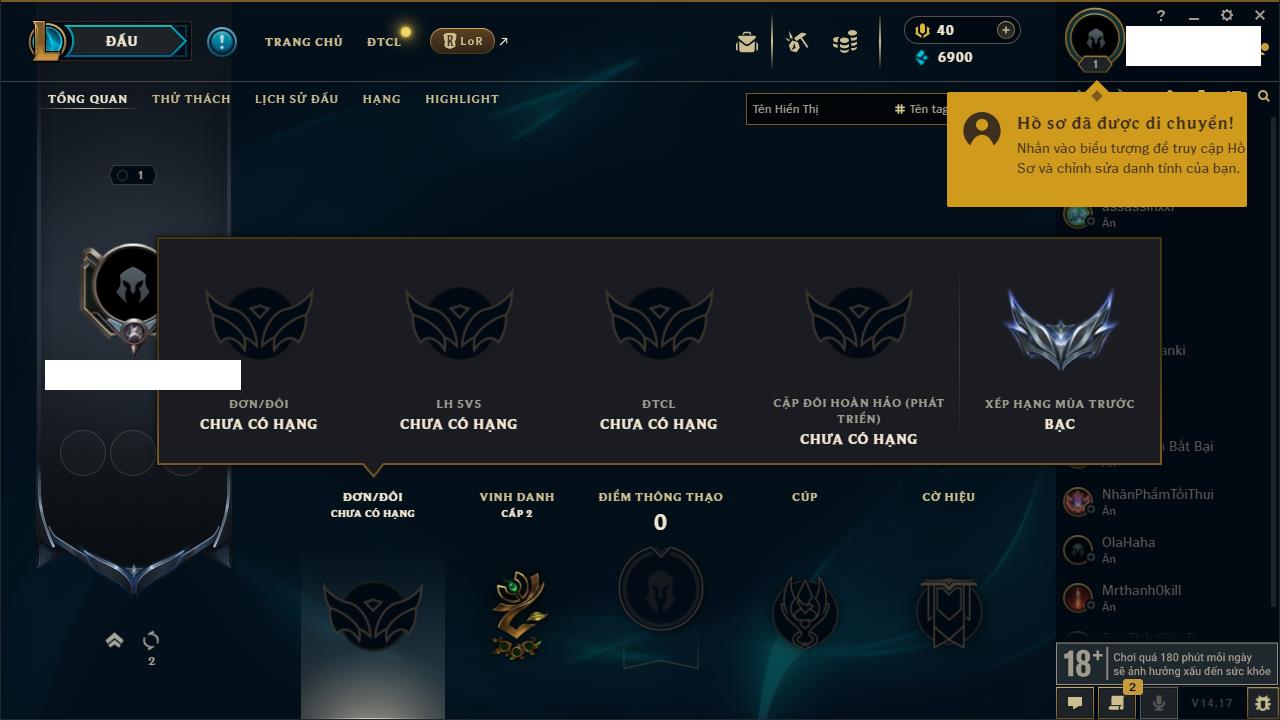Rank Đơn: Lục Bảo IVKhung: VàngTướng: 171 - Còn 154648 THXTrang Phục: 203Rank ĐTCL: Bạch Kim IVLinh Thú: 69
