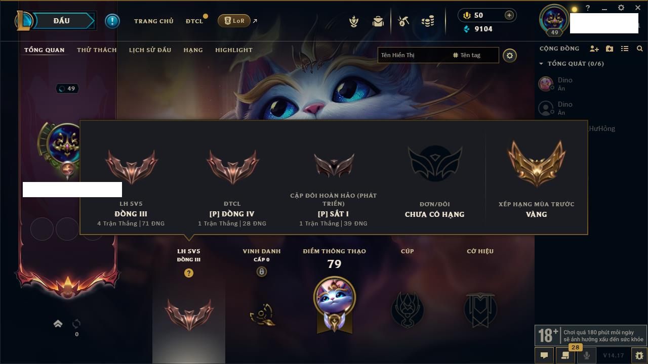 Rank Đơn: Chưa rank mùa nàoKhung: Chưa có khungTướng: 38 - Còn 6280 THXTrang Phục: 2Rank ĐTCL: Chưa RankLinh Thú: 50