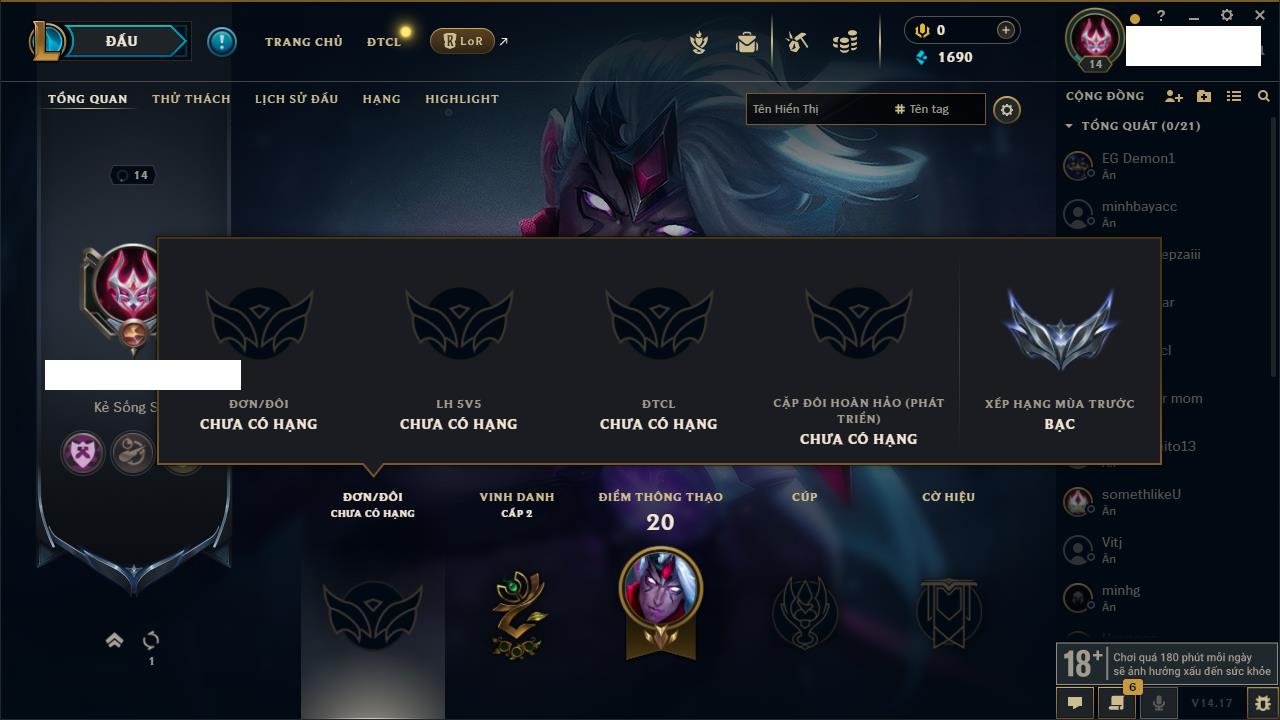 Rank Đơn: Chưa rank mùa nàoKhung: Chưa có khungTướng: 0 - Còn 15550 THXTrang Phục: 0Rank ĐTCL: Chưa rank mùa nàoLinh Thú: 18