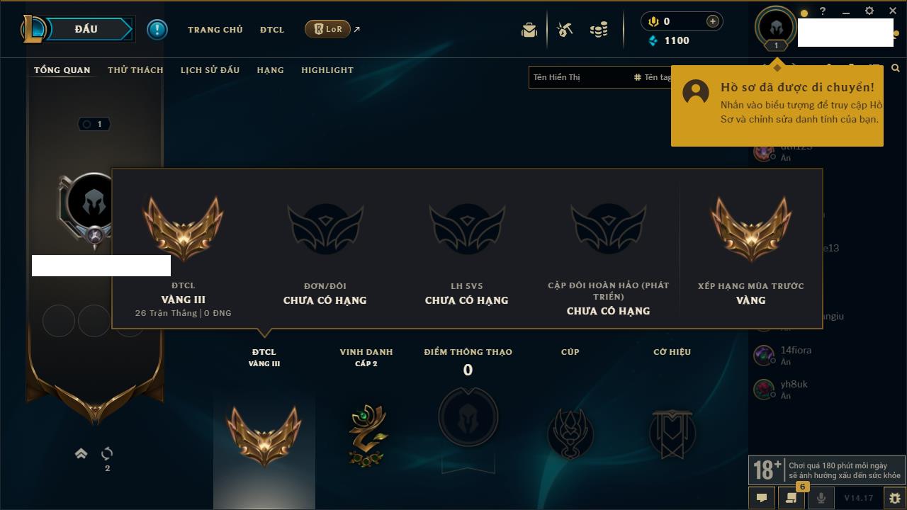 Rank Đơn: Chưa rank mùa nàoKhung: Chưa có khungTướng: 0 - Còn 4000 THXTrang Phục: 0Rank ĐTCL: Đồng ILinh Thú: 18