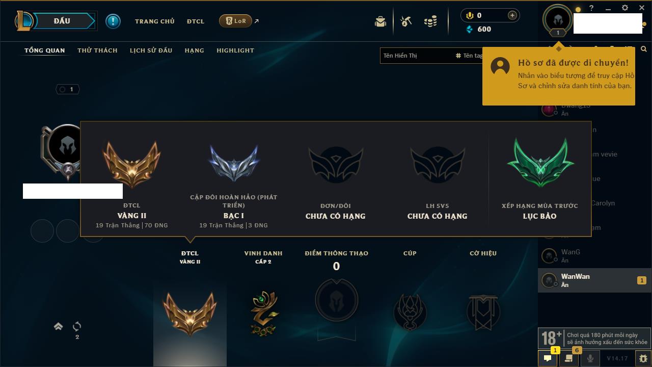 Rank Đơn: Bạc IIKhung: VàngTướng: 171 - Còn 332462 THXTrang Phục: 165Rank ĐTCL: Kim Cương IVLinh Thú: 181